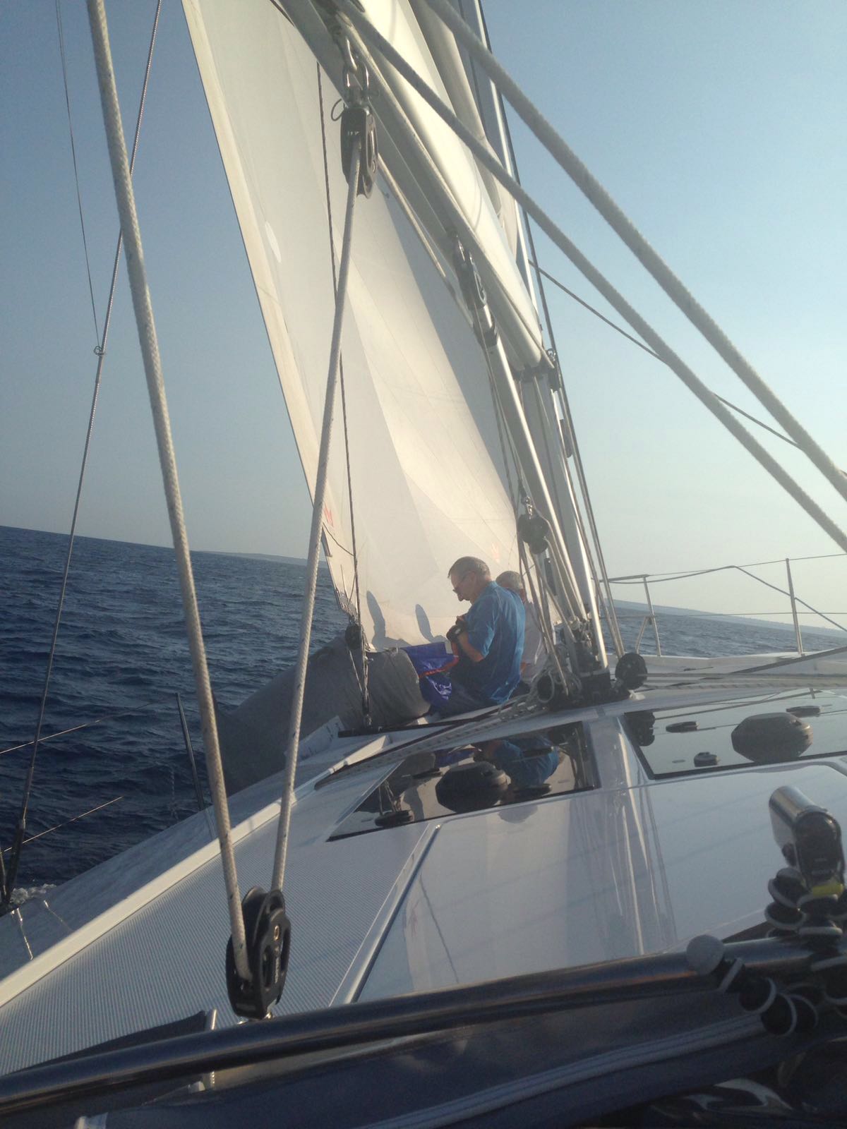 Jon and Me, Foredeckers – Duties included setting up and then striking the gennaker, gybing the gennaker, cursing the gennaker ….., hauling out the jib, retracting the jib and lying on our backs exhausted. Foredeckers ( I am told) are immediately recognisable amongst the crew as they are generally carrying an excess amount of muscle, their arms are normally dragging on the ground, they grunt a lot as opposed to actually articulating words, and they have very large foreheads. They are usually very fit and strong, which is I suppose why Jon and I, the two oldest members of the crew, got lumbered with the job! All attempts at protest fell on the skippers deaf ears.
