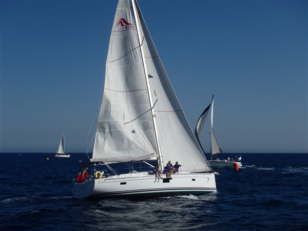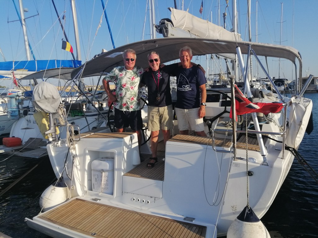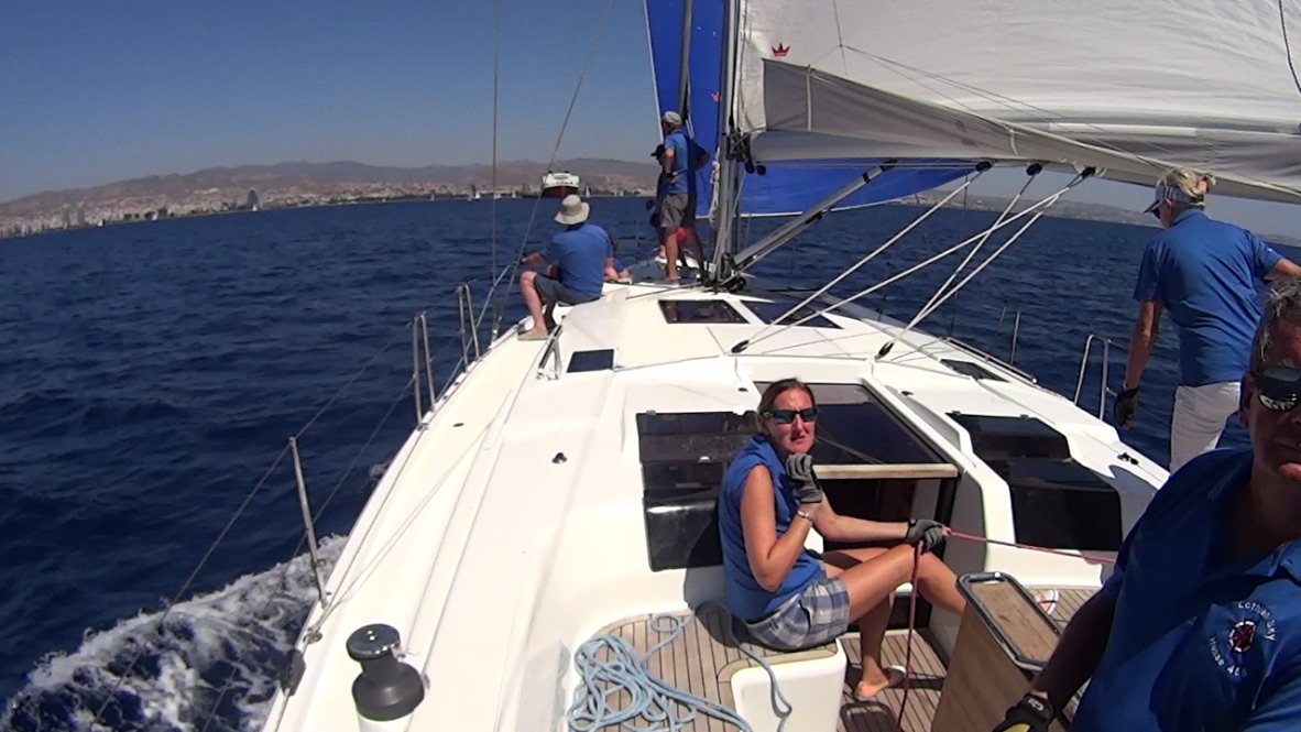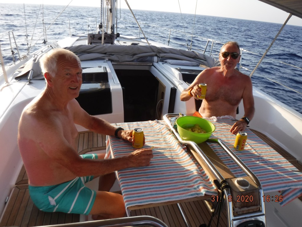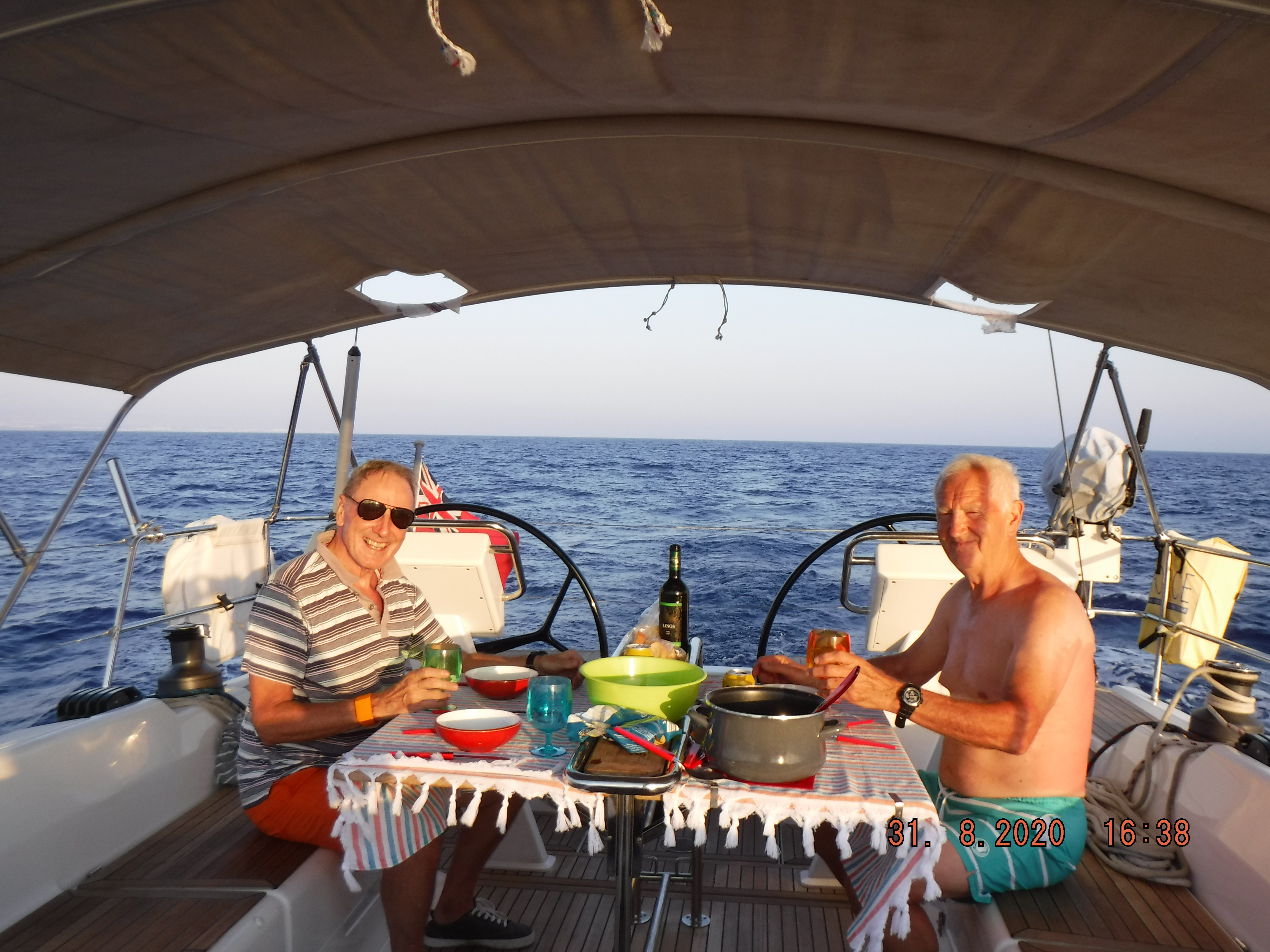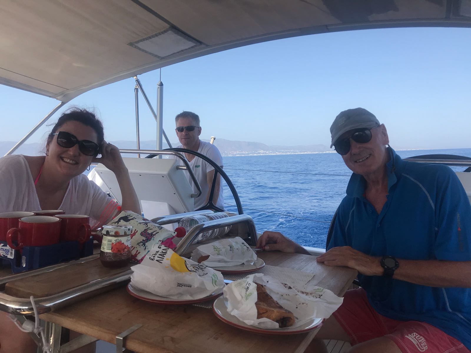 Unfortunately, Ann Cameron – a stalwart of last year’s race – was left on the physio’s table with a bad back. She did however enrol as one of the back-room crew (no pun intended) together with my wife Joan and her sister Isabel Over, without whom nothing would have been achieved. For reasons not entirely clear to me we do not have a photo at the moment of the girls in the back room. I’ll put that right later. Sailing in an average of 35°C, working hard on deck for up to three hours at a time takes a heavy toll, and I cannot tell you how grateful we were for the rolls, water, coke, fruit, crisps, Harobos, whatever supplied on a daily basis by the backroom. And of course when we got home in the evening dinner was served. Champion!