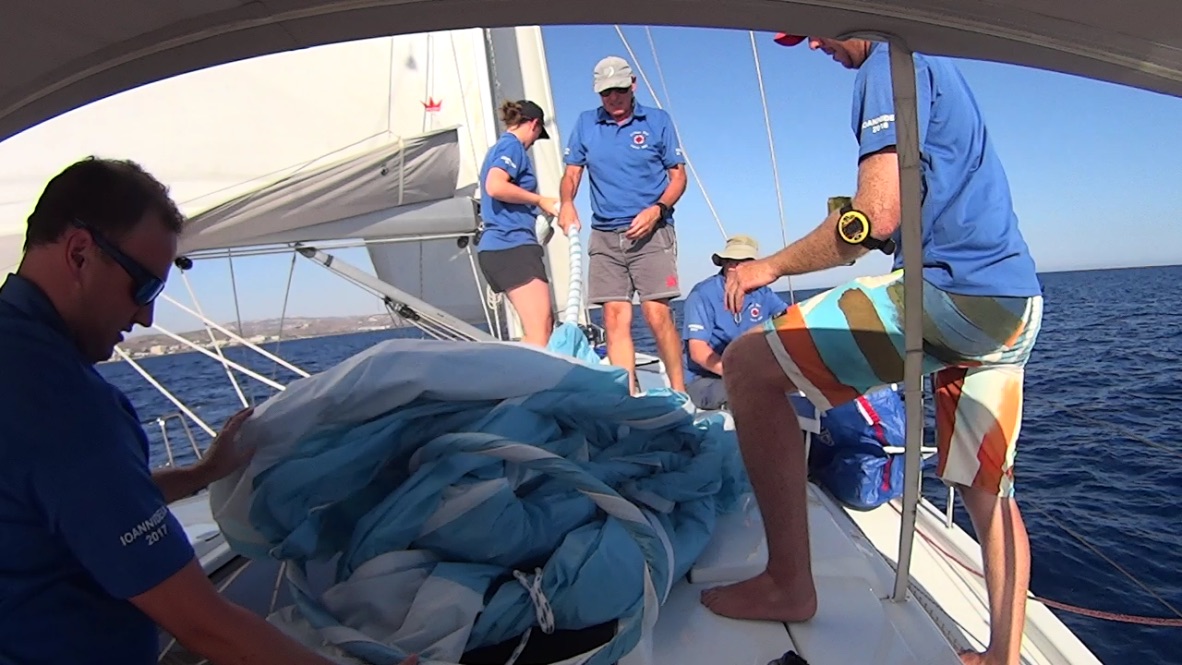 Kneeling are Ruth (introduced in other parts of this blog) and Paul Casterton a mate from our days in Doha. Paul’s wife Hanna was also with us but we did not have enough space for an additional crew member. In effect Ruth and Paul substituted for each other as Ruth had to leave the boat on the Sunday before the final race. Amongst many arduous tasks they had to gather in the gennaker and also operate the main and gennaker sheets.