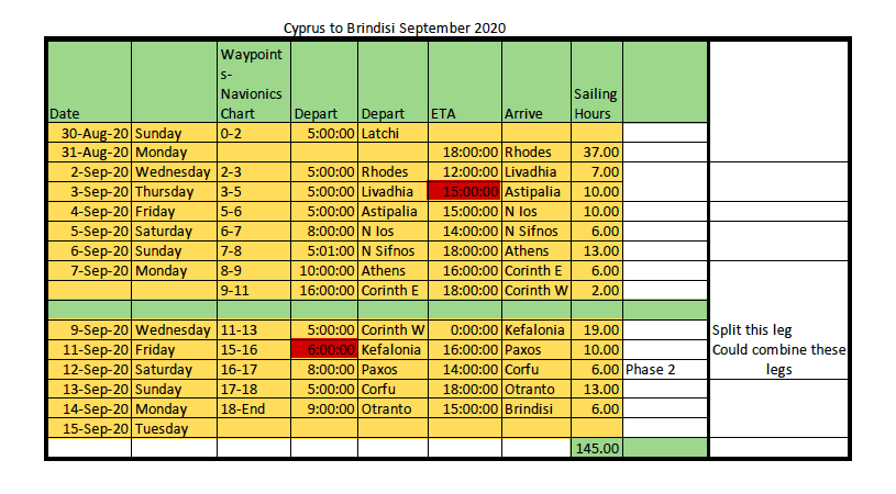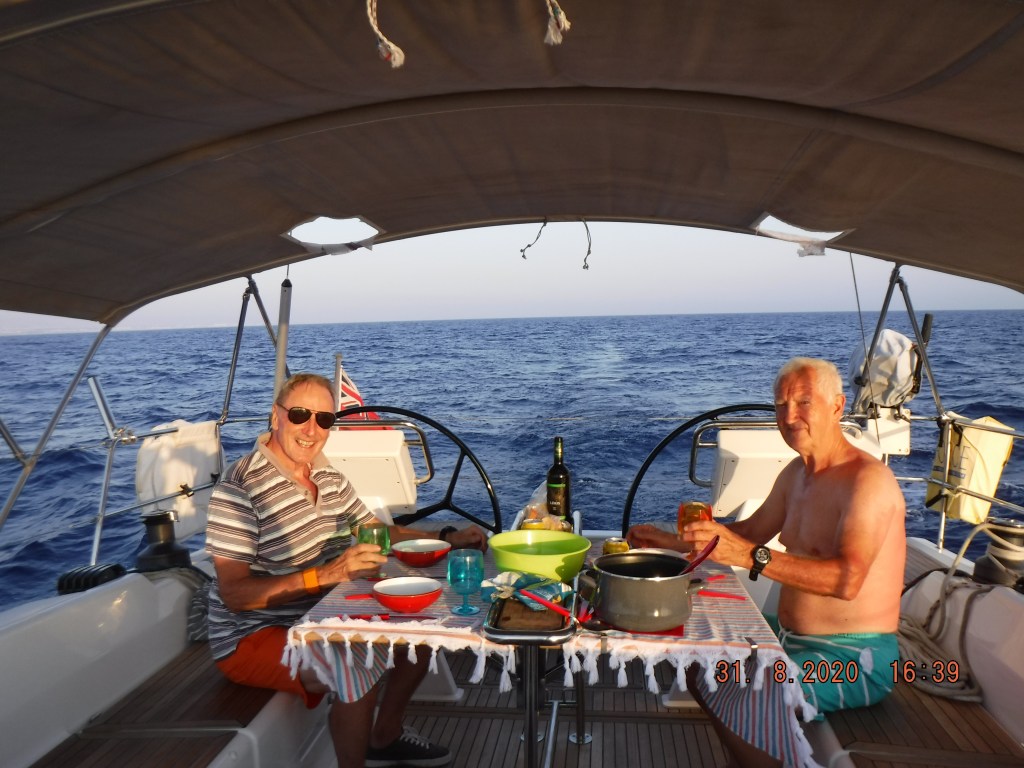 I expect the trip to take about 14/15 days subject to weather. The Meltemi starts to subside in the Aegean during September so I am hoping for a fair passage. With a bit of luck we might even have some easterlies to help us on our way.